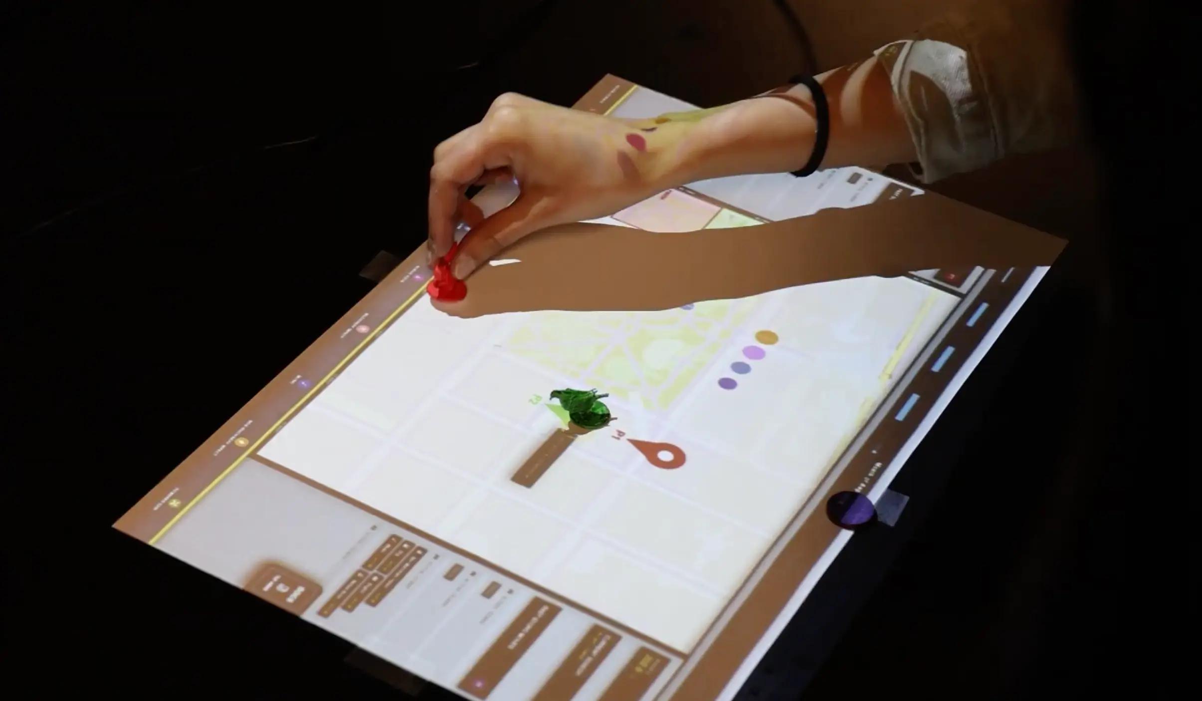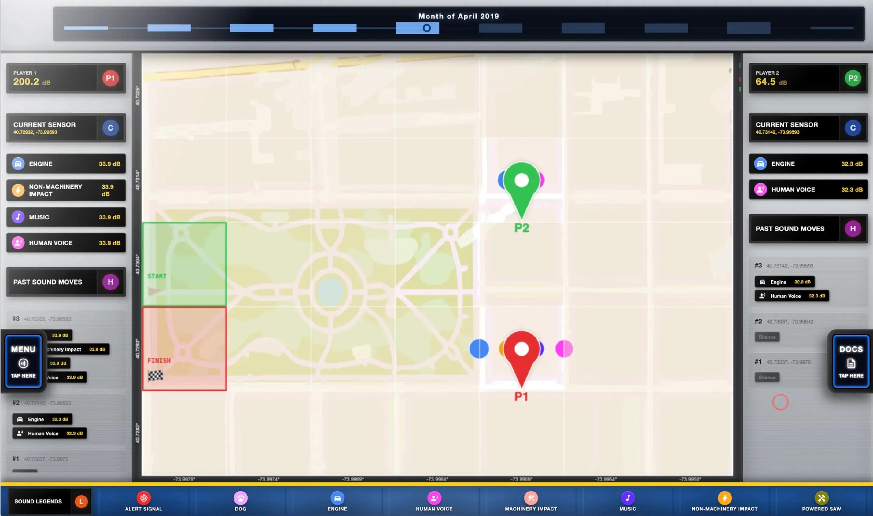 The SONYC Playground is a two-way data visualization project that presents NYC sound data through both a web-based interface and a physical tabletop game. Using geo-tagged audio recordings, users can explore noise patterns digitally or navigate a projected map of Washington Square Park with tracked pawns (featuring familiar NYC creatures: squirrel and pigeon!), triggering sounds and accumulating noise exposure (dB).